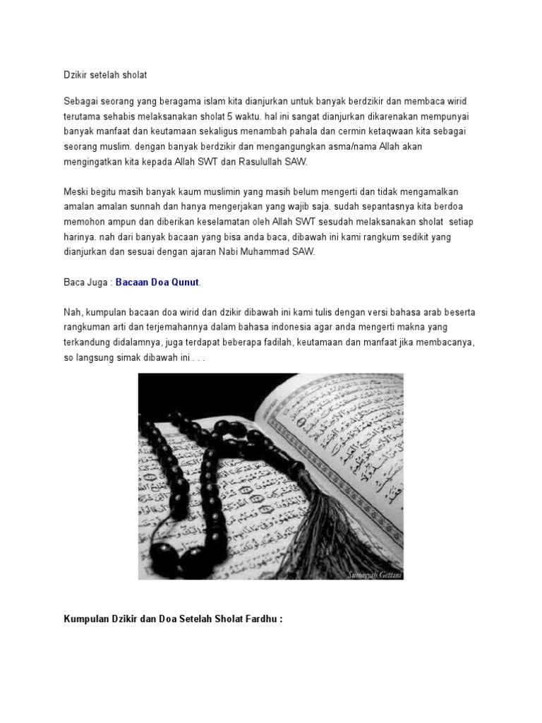 Doa setelah sholat adalah kumpulan dari doa yang telah diajarkan dari al quran dan hadist mulai membaca shalawat atas nabi minta pertolongan dari kejahatan mohon keselamatan baik di dunia maupun akhirat bahkan sampai permohonan untuk kebahagiaan kita di dunia sampai akhirat nanti. Allah swt berfirman selanjutnya apabila kamu telah menyelesaikan sholat ingatlah allah ketika.