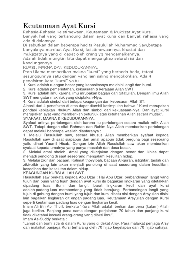 Keutamaan ayat kursi 1000x. Dalam tauhid uluhiyah ubudiyah dan rububiyah ayat kursi merupakan ayat untuk menyucikan allah dan bagi mereka yang mengamalkannya maka allah akan mensucikan mereka. Banyak sekali keutamaan dari ayat kursi. Untuk pembahasan sekarang akan lebih jauh untuk mengetahui tentang rahasia rahasia ayat kursi mengenai keistimewaan keutamaan manfaat ataupun khasiat membaca ayatul kursi dan sangat lengkap.