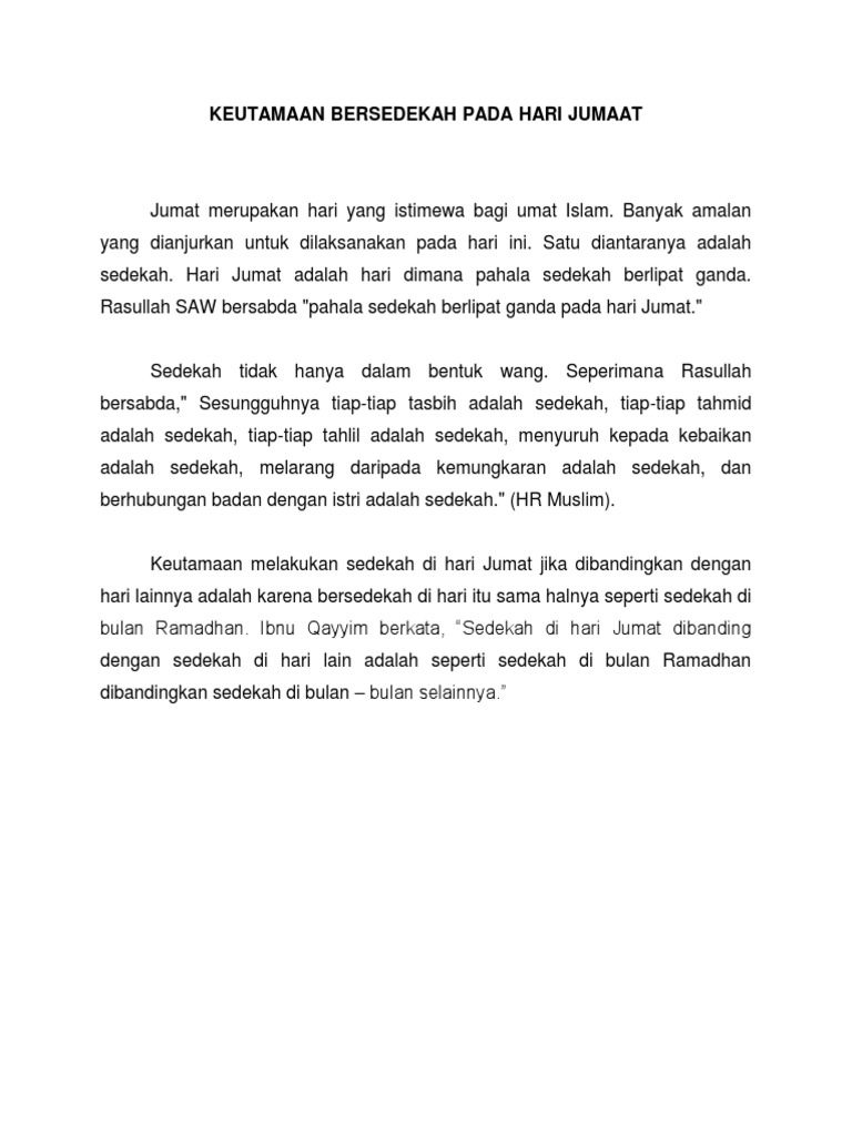 Mengenai apa saja keutamaan hari jumat anda bisa pelajari di. Keutamaan hari jumat begitu menawan hati. Di dalam literatur fiqih anjuran bersedekah di hari jumat sebagaimana waktu waktu utama yang lain memiliki nilai keutamaan lebih besar dari pada waktu lainnya.