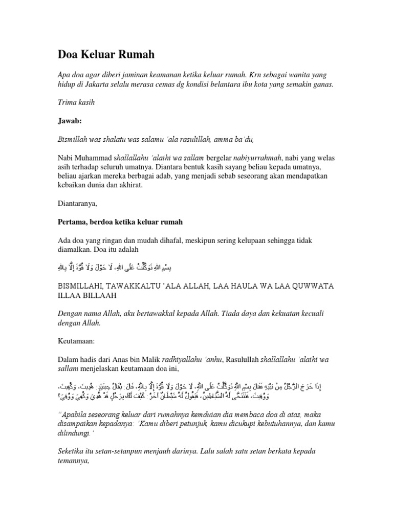Barang tentu hal ini yang kita harapkan sebab setiap orang rasanya ingin terhindar dari sesutu yang buruk. Artikel 59 event 21 profil 12 agenda 7 lokasi 2 kontak 1 testimoni 1 doa keluar rumah dan masuk rumah doa keluar rumah. Bismillah was shalatu was salamu ala rasulillah amma badu.